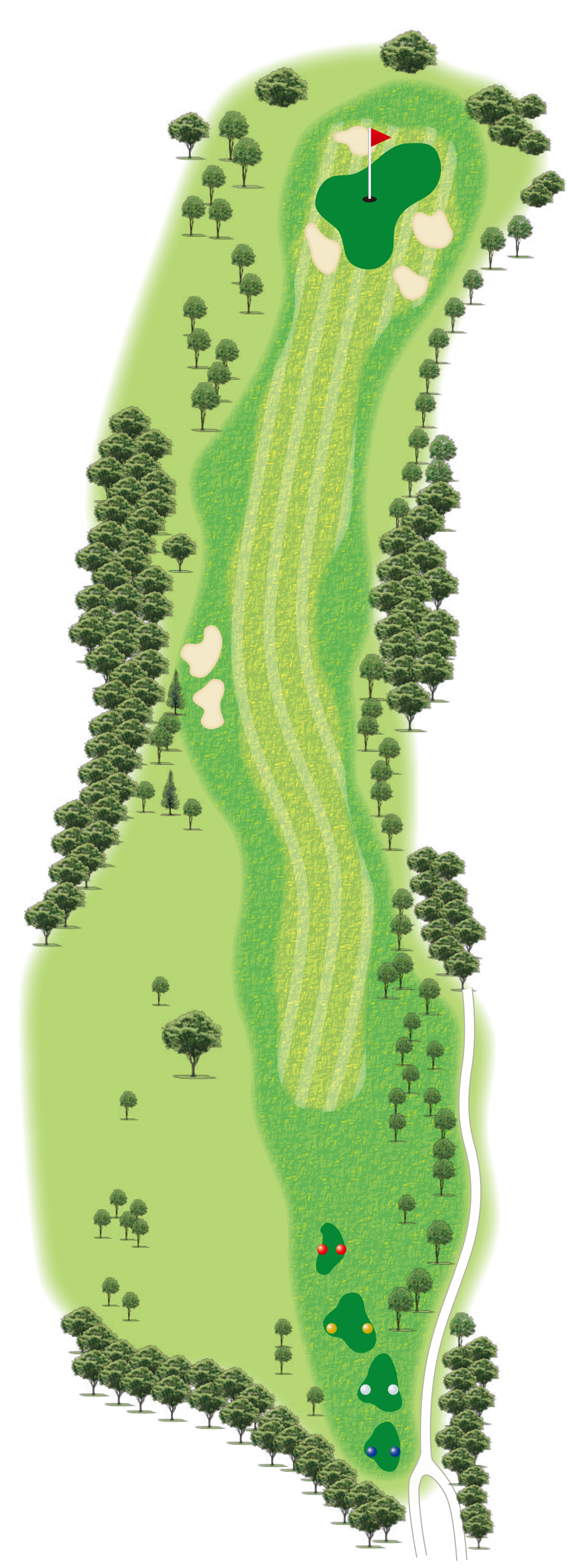 ホール攻略POINTクラブハウスを望むアウトの上がりホール。距離がある上にグリーンが4つのバンカーにガードされたタフなパー4ホール。点で攻める2打目の正確さがホール攻略の鍵となる。
